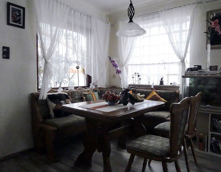 1979 folgte dann, zusammen mit der Nachbarhälfte, der Anbau. Dieser beinhaltet die Erweiterung um eine Küche, ein Bad und einem Wintergarten. Die Gesamtwohnfläche beträgt